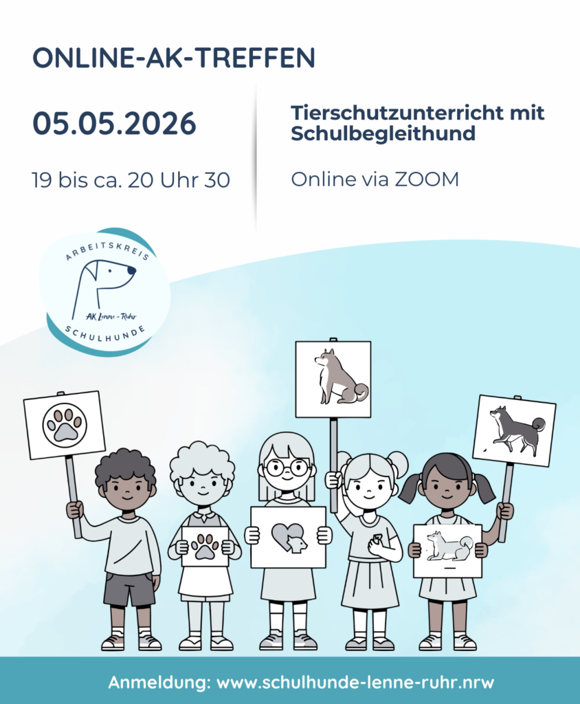 Unser geplantes Präsenztreffen am 20.03.2026 muss leider verschoben werden. Alternativ bietet der AK-Lenne-Ruhr aber einen Online-Treffen zum Thema „Tierschutzunterricht mit Schulebegleithund“ an.